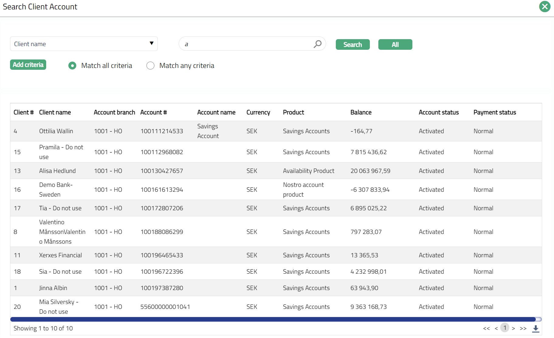 - Account # field is a hyperlink. Click hyperlink. Aura displays the Search Client Account page. Input the required search criteria to see a list of all the current accounts where the account currency matches the list of currencies specified in the Transaction default chosen. Select the required Account #.