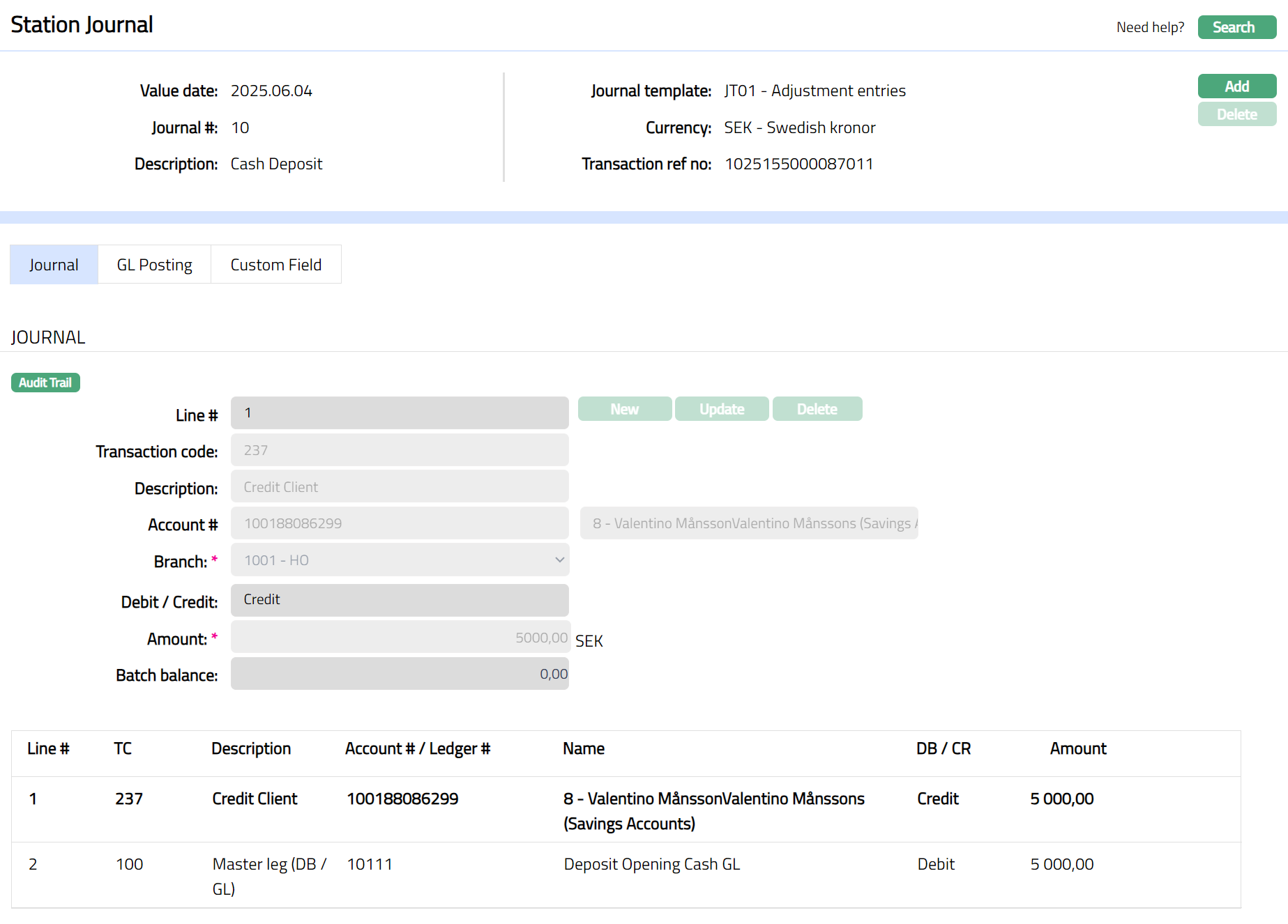 Note: In Day Journal Page, the status of GL Posting tab will appear as Posted for the Cash Deposit transaction and will default all the details from the Station Journal Screen. The same has to be approved in the Day Journal screen. On approval of the Day Journal, the status is updated as Approved; and you can verify the accounting entries from using General Ledger > Transaction Review > Statement.