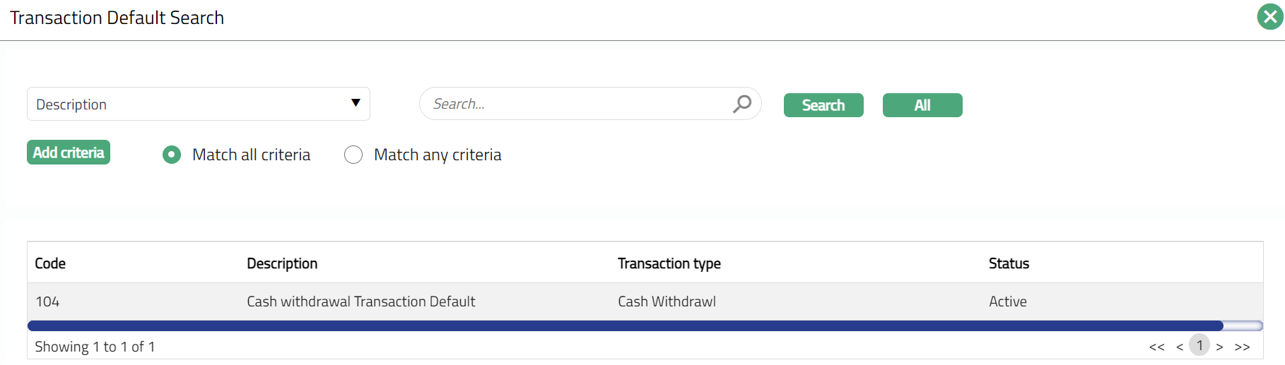 - Click Transaction default hyperlink. Transaction Default search page appears with the list of transaction defaults maintained under Retail > Settings > Transaction Defaults. Select required Transaction Default.
