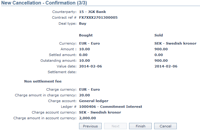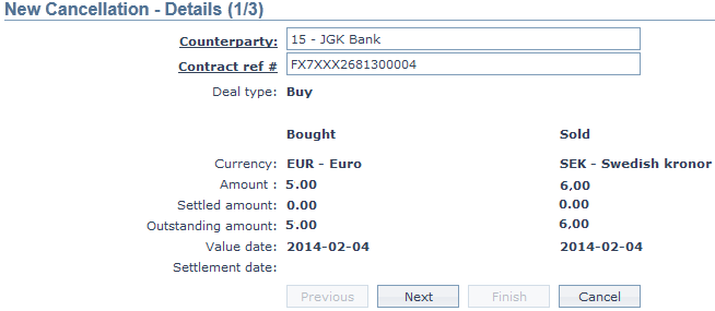 Cancellation is annulment of any contract at the instance of the counterparty. Charges may be applied on such annulment. Any FX contract in which both the legs have not yet been settled can only be Cancelled. If the contract has just been booked (with Contract, Record status Open/Active, Pending), the Contract can only be deleted and not Cancelled.