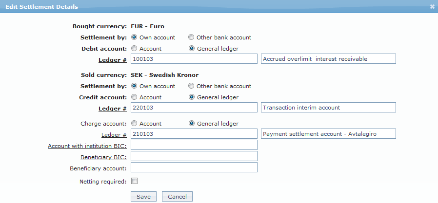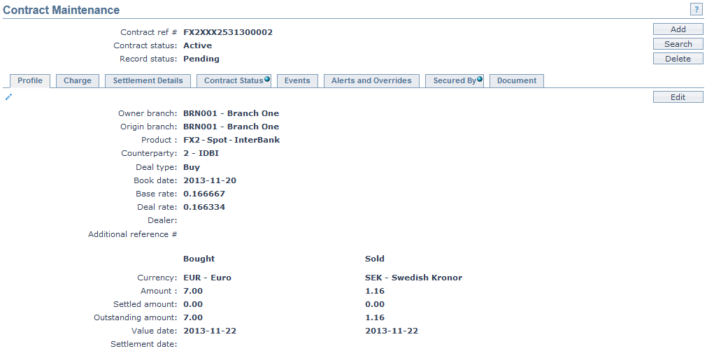 The Settlement Details tab allows you to view and edit the details pertaining to the settlement instruction for the Contract created at the product level. If Counterparty specific settlement instruction for bought currency and sold currency is not available then the generic settlement instruction for the currency can be used for the contract.