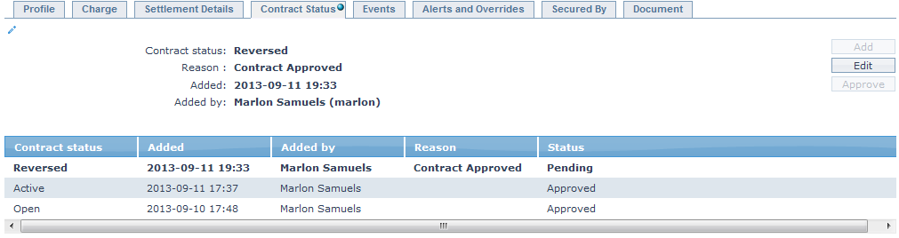 Note: On adding the New Contract status the status of the tab becomes pending till it is approved by another user. On approval, the tab status is set to Approved.