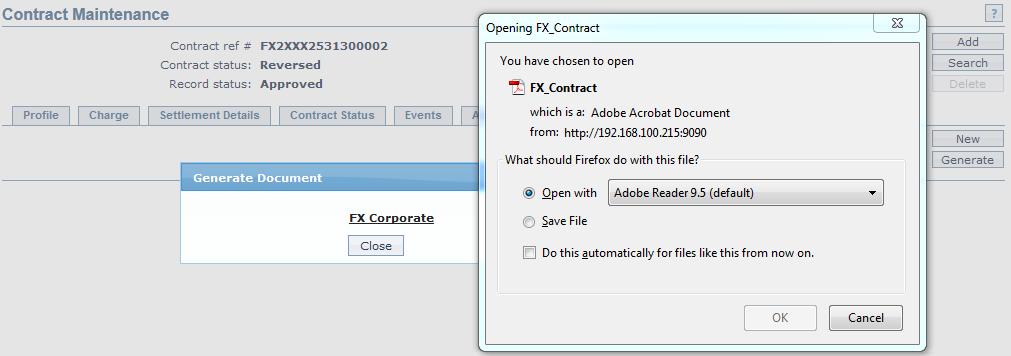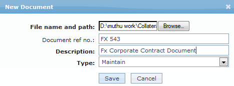 The Document tab allows you to upload documents related to the FX contract. These can be in the form of scanned images or files on your computer. You can categorize the documents as per Document Type and store with a document reference number.